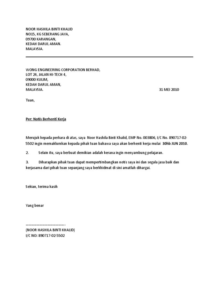 Dalam surat anda, nyatakan tarikh khusus yang anda bercadang untuk meninggalkan kerja. If you are author or own the copyright of this book, please report to us by using this dmca report form. Sebaik sahaja anda telah memutuskan untuk berhenti kerja anda, perkara yang perlu dilakukan adalah mengemukakan surat berhenti kerja. Untuk makluman anda, surat notis berhenti kerja (resignation letter) kebiasaannya ditulis samada dalam tempoh 24 jam, ataupun sebulan dan 2 bulan. Contoh surat berhenti kerja notis 1 bulan nama pekerja alamat tempat tinggal pekerja tarikh.